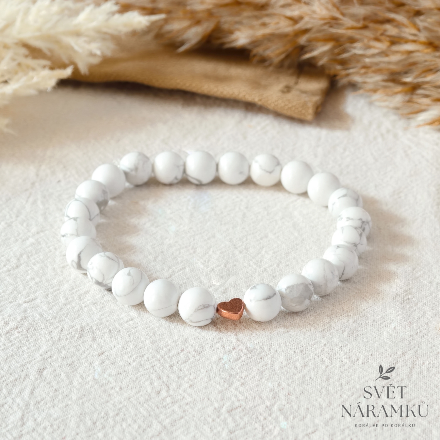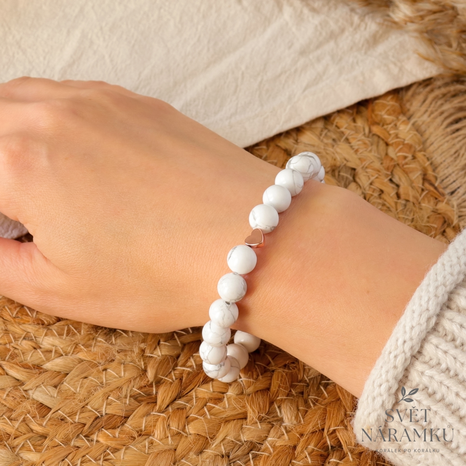 V jednoduchosti je krása. Náramek v minimalistickém stylu – bílý howlit a srdíčko z hematitu v rose barvě jako jemné připomenutí lásky a vnitřního klidu.
